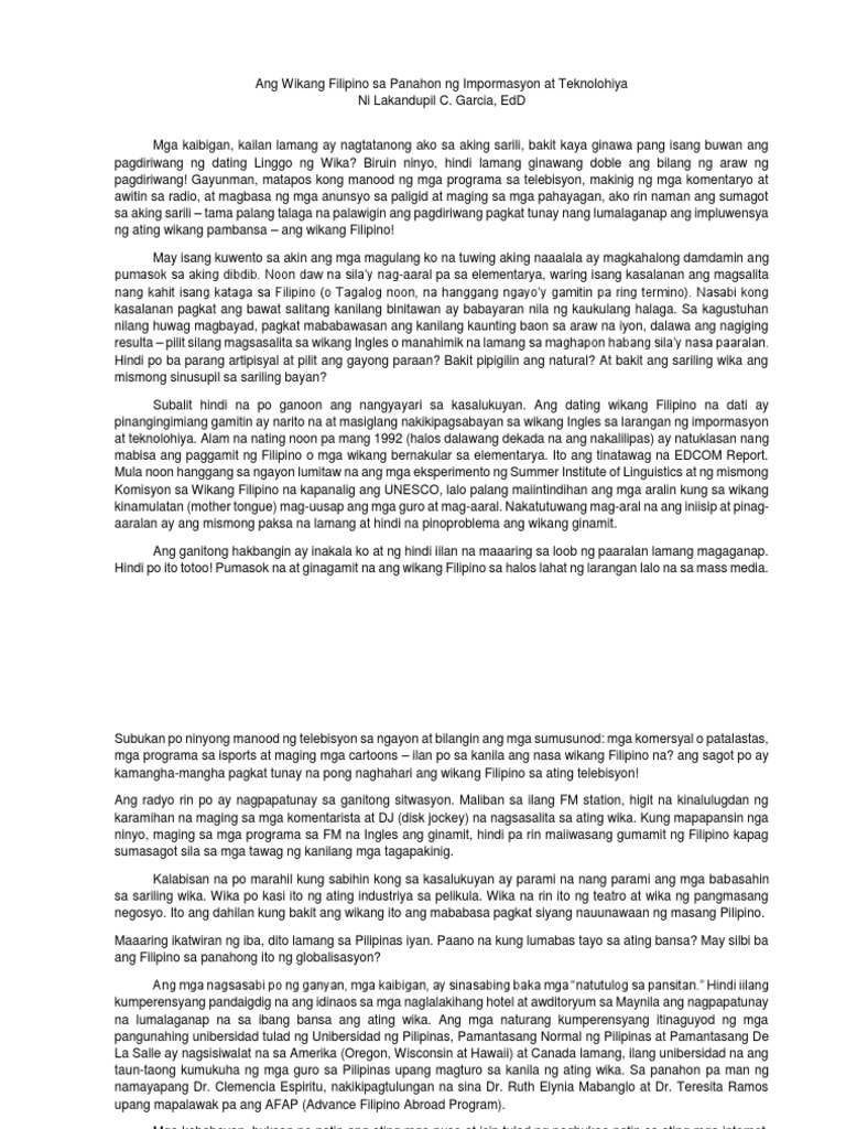 As per applicable law your personal information may be disclosed to any potential or actual third-party transferees or acquirers and may be among those assets transferred. Ang sanaysay na ito ay para maipakita ang mga pagmamahal ng sumulat tungkol sa ating wikang pambansa. Nakasaad sa Konstitusyong 1987 ang mga probisyon kaugnay ng pagpapaunlad at pagpapayabong ng Filipino bilang wikang pambansa sa pamamagitan ng paggamit nito bilang midyum ng pagtuturo sa sistema ng edukasyon at pamamahala.
